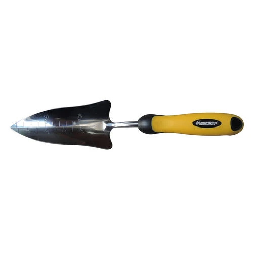 This ergonomically designed garden transplanter with pointed tip and depth markings is perfect for container gardening and anywhere you have tight places to get in between. It features a narrow shaped heavy-gauge polished stainless steel blade and an extra comfortable contoured handle with a soft non-slip rubberized grip.