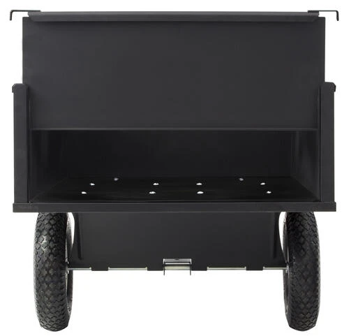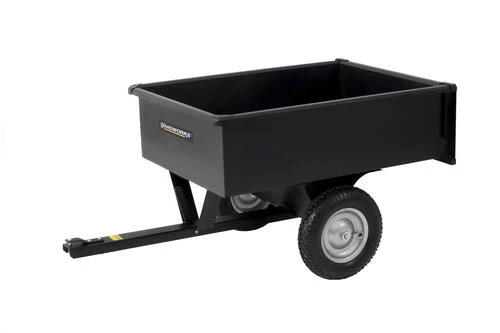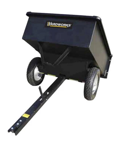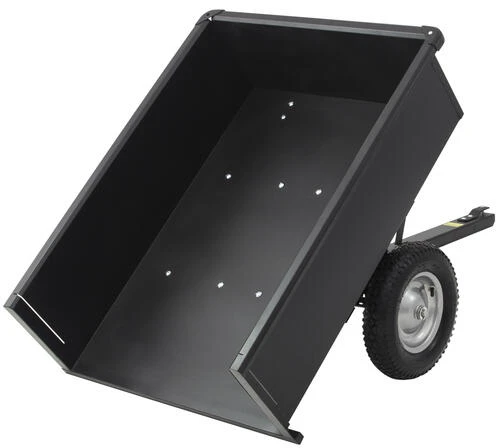 This 10 cubic foot steel dump cart has a one-piece welded body and 750 pound capacity for heavy hauling. The removable tailgate makes for easy dumping of material. It features an easy dump release handle and 16-inch pneumatic tires to handle the heavy loads. It includes a one-year warranty and is powder-coated to prevent rust. It is excellent for hauling wood, leaves, and yard debris. This unit can be assembled in less than 30 minutes.